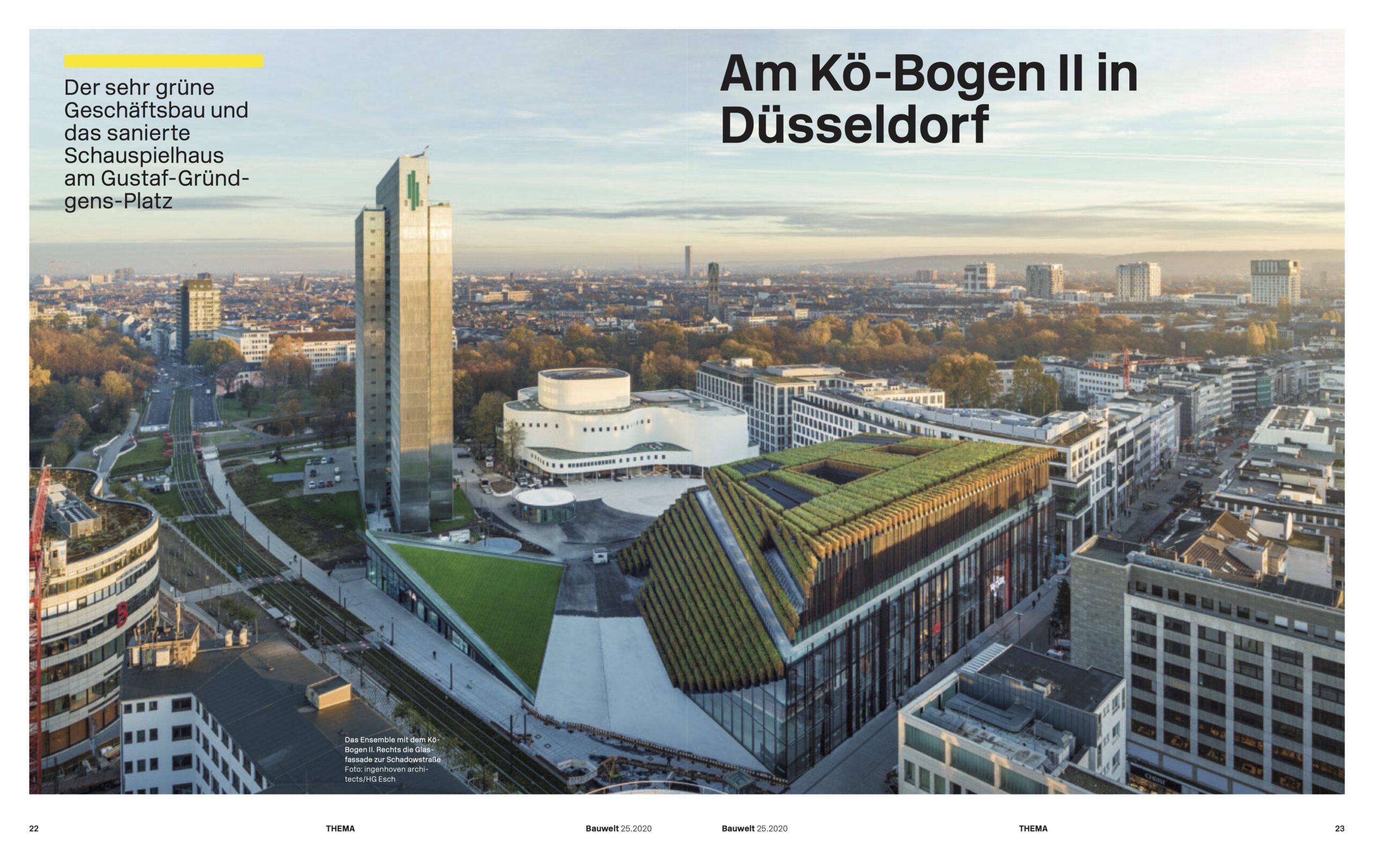 Fertig wurden in diesem Jahr Ingenhovens Geschäftshaus Kö-Bogen II, nach dem Kö-Bogen I von Daniel Libeskind 2013. Die Zeiten ändern sich schnell. Während der erste Kö-Bogen nur „Cuts“ mit etwas Grün aufweist, ist der zweite weitgehend von Grün umgeben. Ingenhoven sanierte auch gegenüber das Schauspielhaus von 1970. Wir stellen beide Bauten vor. (…)“ Sebastian Redecke, Bauwelt Read more.